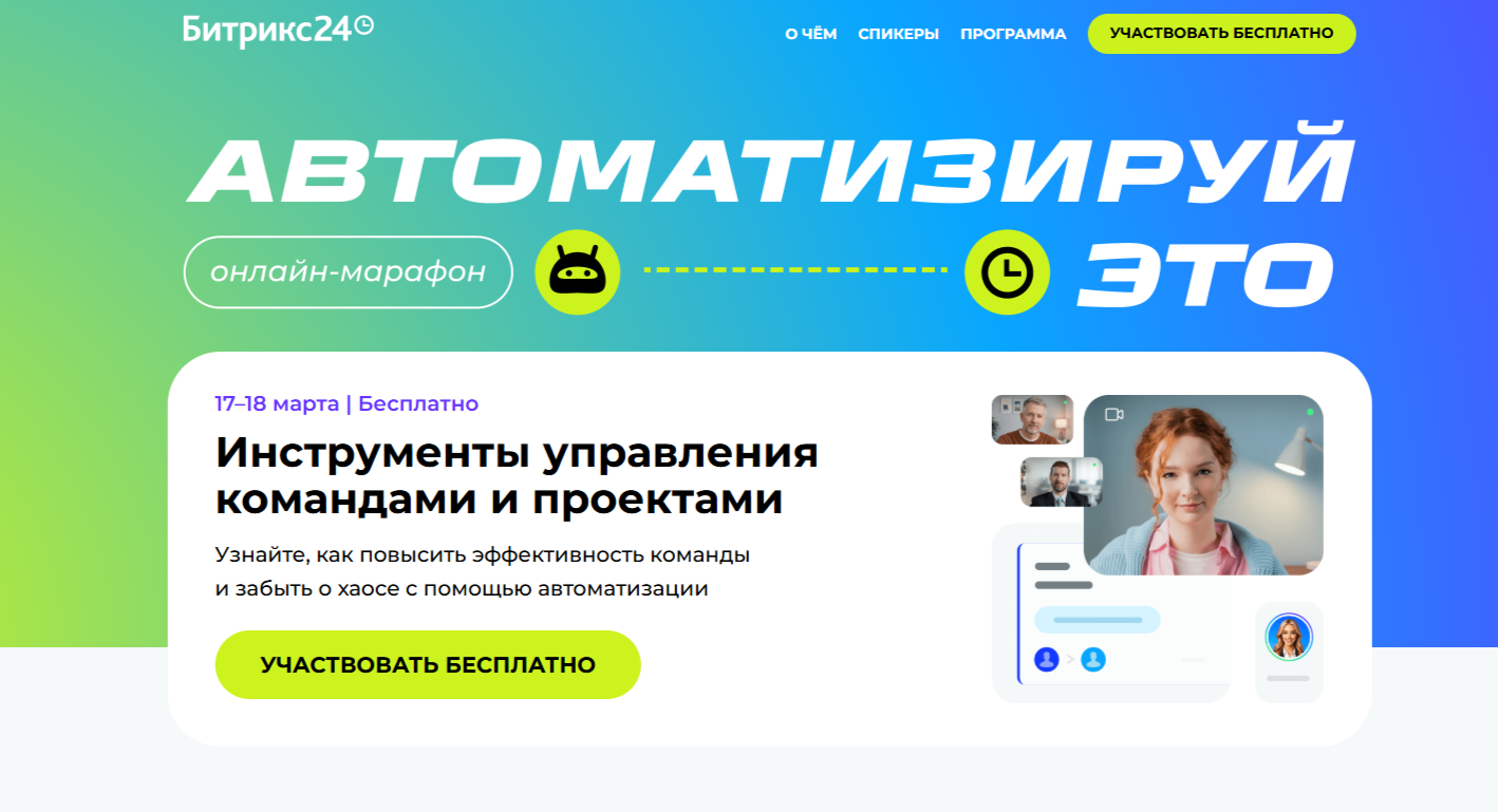 17 марта пройдет онлайн-конференция, посвящённая возможностям и практическому применению платформы Битрикс24 в бизнесе. К участию приглашаются предприниматели, руководители компаний и специалисты, заинтересованные в повышении эффективности управления и автоматизации процессов.